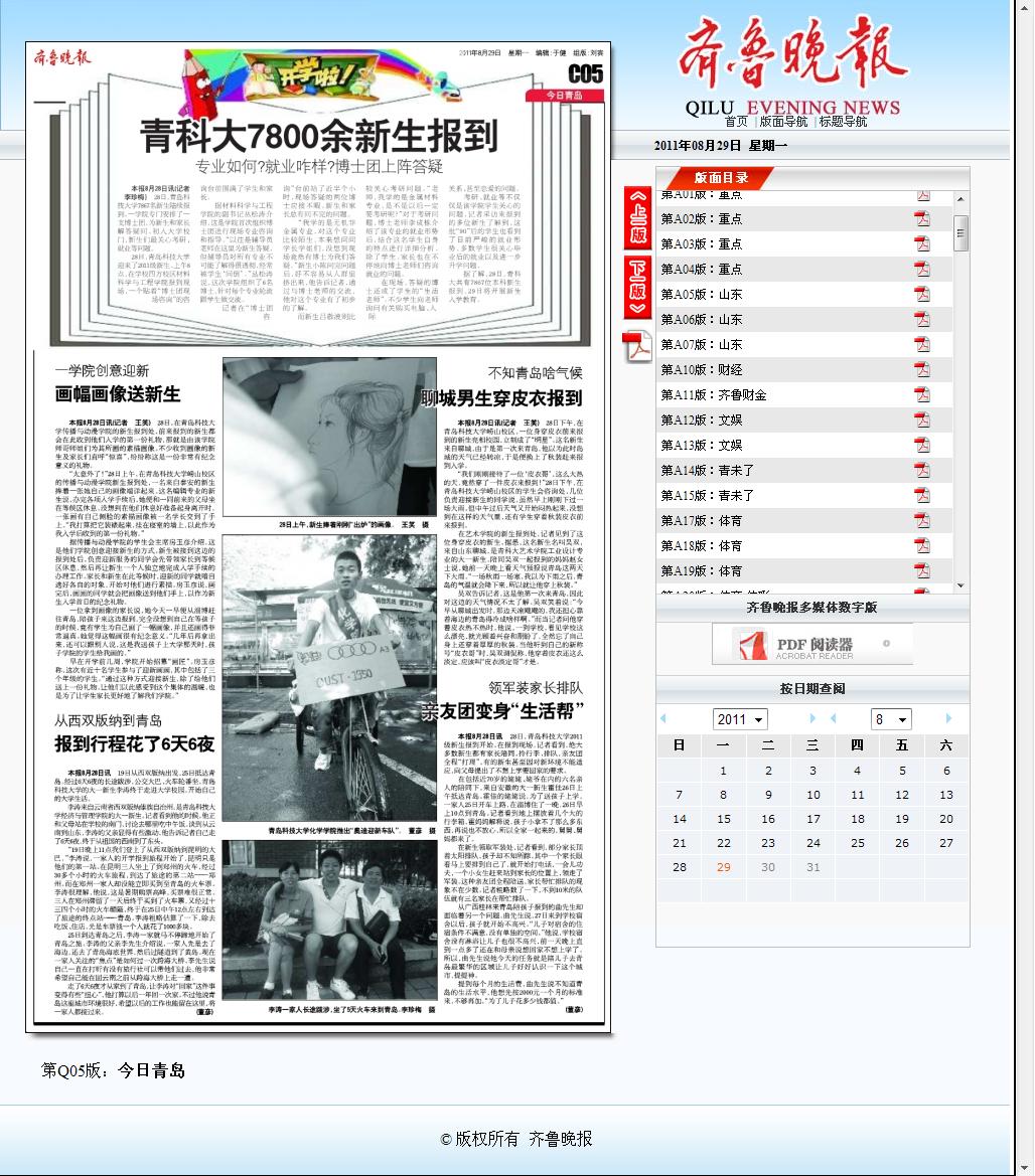 8月28日,大赢家比分 2011级新生261人报到入学,8月29日《齐鲁晚报》以《画幅画像送新生》为题对大赢家比分 迎新情况进行了报导。