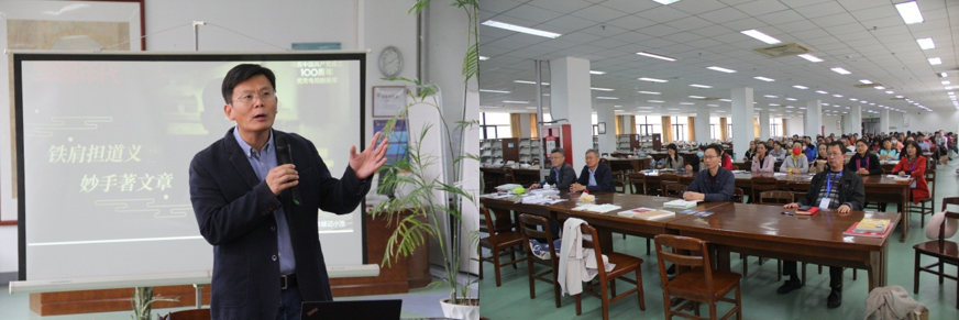 聘任仪式后,刘耀辉为图书馆全体党员和教职工做“党建引领 以和致衡”专题报告,报告引经据典,妙语连珠。刘教授先从“北大红楼”和李大钊先生切入,指出李大钊是中国最早的马克思主义传播者,曾和毛泽东等人开展革命活动,在二十七岁时手书“铁肩担道义,妙手著文章”,这十个字也成为他以救国救民为己任、宣传马列主义的光辉一生的真实写照。针对在当前如何做好 “党建引领 ”,实现“ 以和致衡”,刘教授指出实现路径在于“诗教”,中国是文化大国,从《诗经》到《红楼梦》再到毛泽东诗词都是非常好的诗教读本,建议大家结合党史学习教育认真阅读。