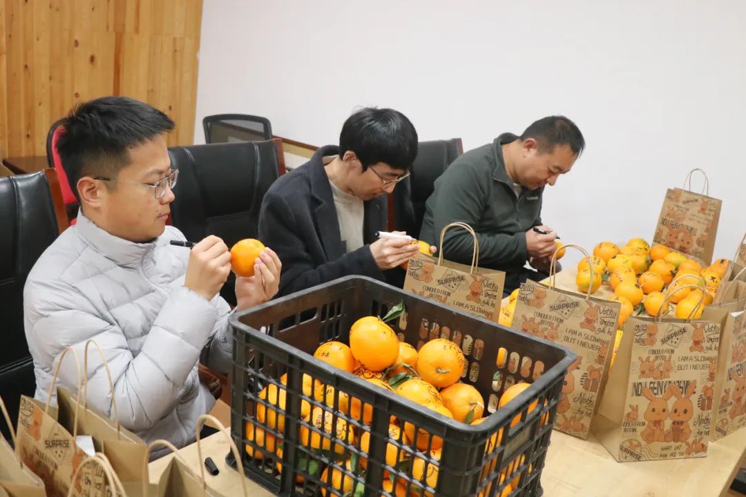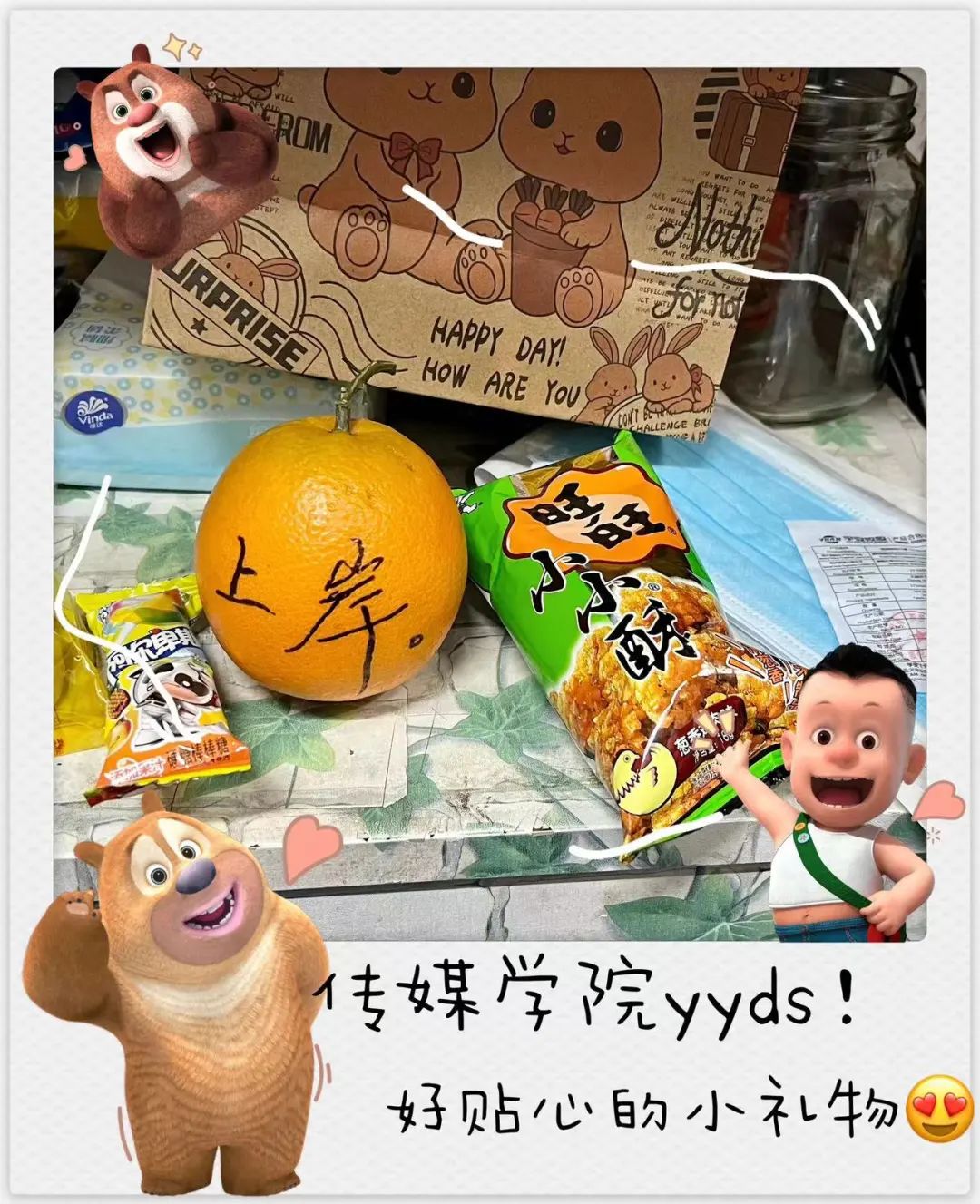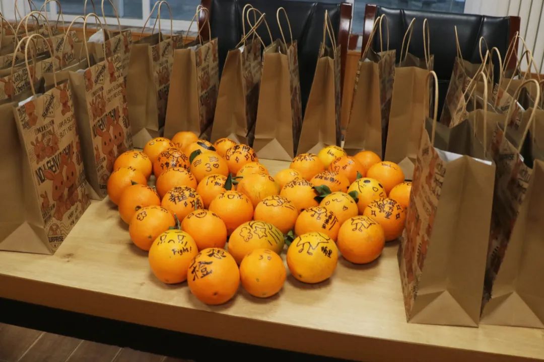 团委老师和同学们亲手准备有趣又暖心的小礼物——“好运脐”,甘甜圆润的橙子被文字和图案赋予了新的含义,寓意旗开得胜,马到成功。绘制完毕,同学们设计摆出“上岸”“加油”和爱心形状,带有祝福的橙子为考研学子加油助威。除此以外,礼物袋里还有代表“你最棒”的棒棒糖和“好运旺旺”的旺旺小小酥给考生加油鼓劲。