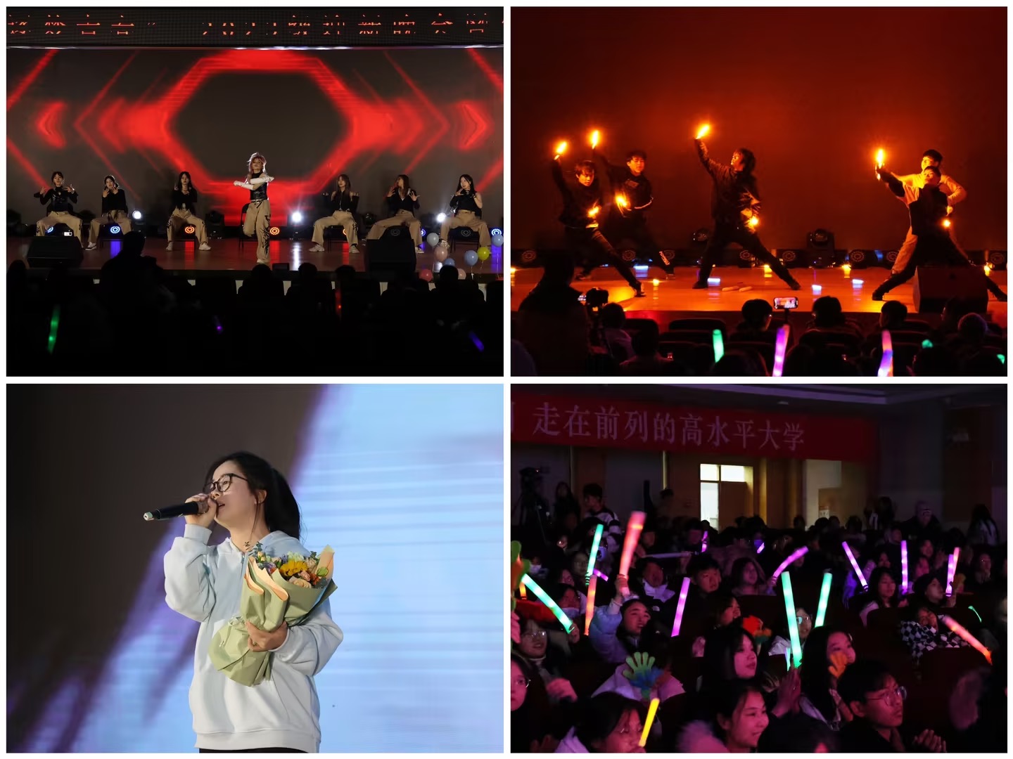 崔淳细腻温暖的嗓音将《意外》一曲唱出意蕴,深情款款、扣人心弦,令人陶醉其中;街舞《快乐崇拜》动作流畅,从中流露出的热情和活力感染在场每一个人;小品《水煮三国》的演员们用有趣的动作和幽默的语言诠释了“桃园三结义”和“三顾茅庐”的故事,引得在场师生们鼓掌欢呼,开怀大笑,观众席一片热闹;充满爆发力的背景,每一笔都是精心雕琢,“演完就解散”乐队带来的表演使现场气氛再被点燃,直达高峰。