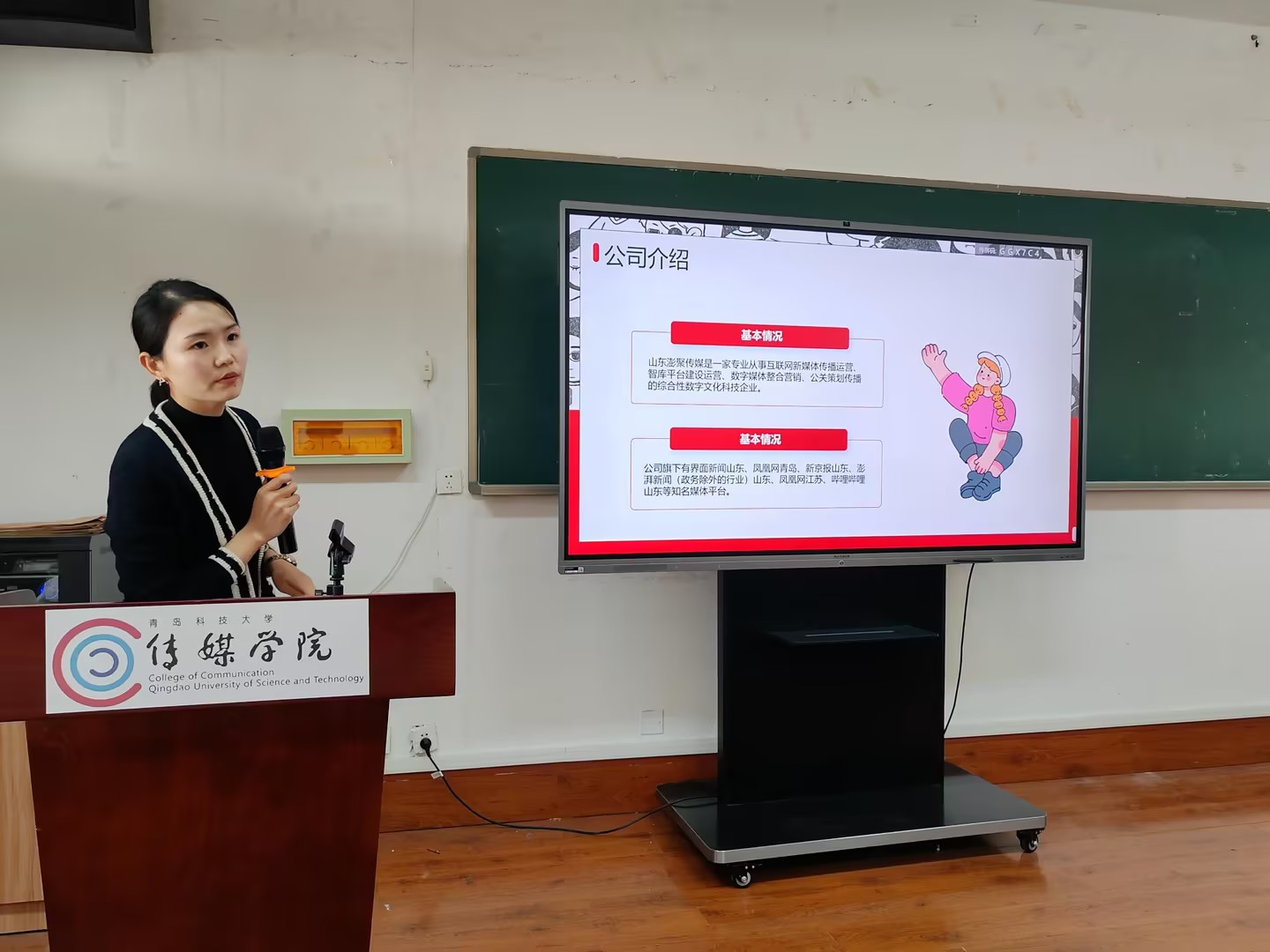 宣讲环节,山东澎聚传媒运营总监田悦锦、人力资源部孙悦通过播放短视频、PPT展示、答疑交流等方式向大赢家比分