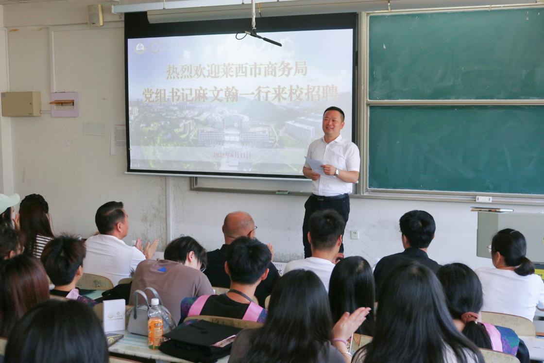 麻文翰介绍了莱西市在经济发展、产业升级、招才引智等方面情况,重点讲解了青岛天才豆图书有限公司、青岛汇通世纪传媒有限公司、青岛成昌因特皮包有限公司等单位的经济效益和区位优势。他指出,本次招聘宣讲会采用“政府搭台、校企联动”模式,聚焦企业发展需求,精准对接高校人才,推动“政企校”三方实现合作共赢;诚挚邀请青科大毕业生到莱西建功立业,应聘到对口企业一起共建未来。
