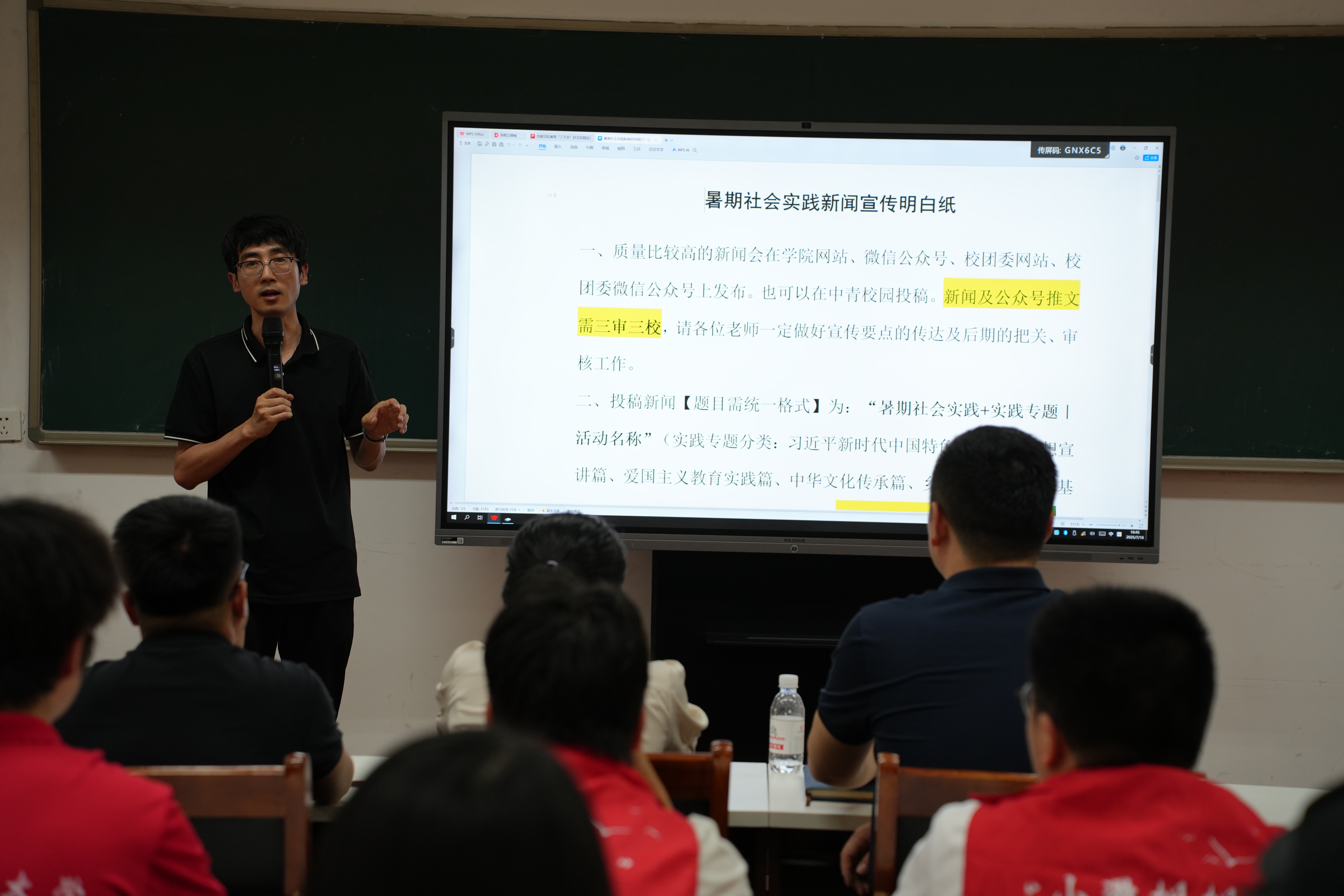 赵岩传达了校团委对于本次暑期社会实践新闻宣传工作的具体要求,希望各团队在社会实践活动开展前应根据团队自身的活动重点和活动特色,围绕“青春为中国式现代化挺膺担当”的主题,认真规划制订宣传方案,活动过程中及时向校内外平台报送新闻稿件等相关材料。