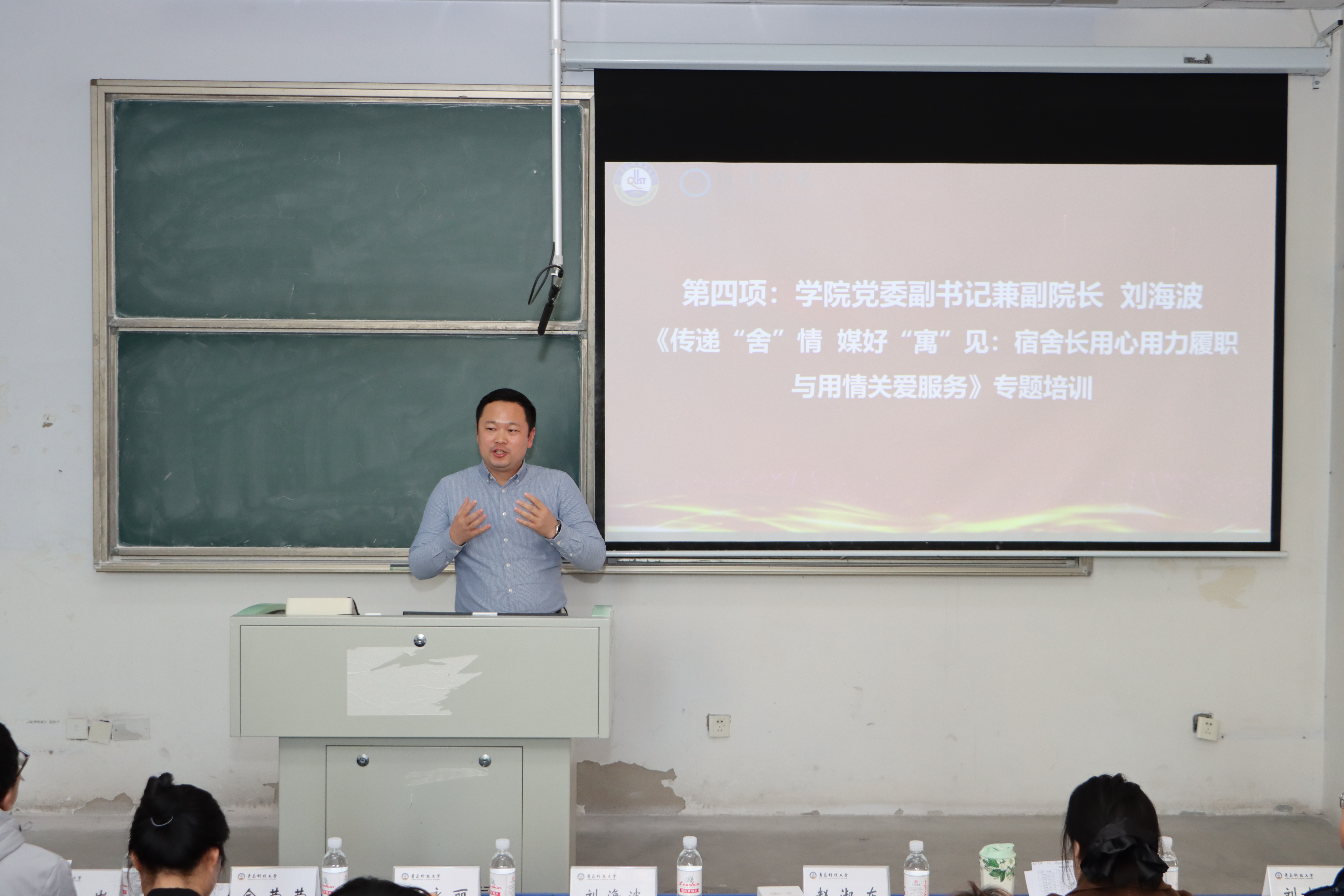 刘海波以《传递“舍”情,媒好“寓”见:宿舍长用心用力履职与用情关爱服务》为题,从“用心观察、用力履职、用情服务”三个维度,深入浅出地讲述了舍长工作的方式方法和目标任务,并向全院学生舍长提四点希望:一是加强党建引领,争做宿舍建设的引领者。要对照党员标准严于律己,以身作则当好宿舍当家人、协调员和守护员。二是筑牢安全底线,争做宿舍建设的践行者。要严格落实学生公寓管理规定,落实“四勤、五不、六要”公寓规范。三是保持内务整洁,争做宿舍建设的示范者。要加强宿舍文明创建、内务卫生整理、自我管理服务,共同营造干净整洁、文明有序的宿舍环境。四是珍惜同窗情谊,争做宿舍建设的传播者。要心怀感恩,理解包容,在团结互助的宿舍环境中快乐的读书学习,健康的成长发展。