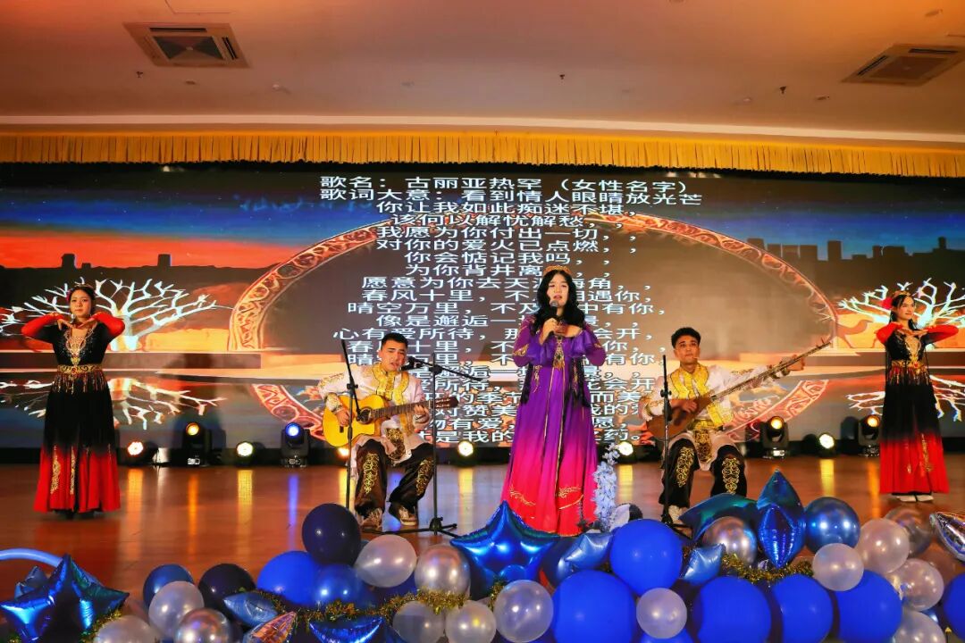 都塔尔弹唱《新疆民歌》奏响浓郁的民族风情,独特的乐器与动人腔调,让观众领略到多元文化的魅力;综合相声《班长的心事》通过活灵活现的表演,将校园趣事演绎得绘声绘色;舞蹈串烧《青春舞步》旋律轻快,把青春里的小确幸娓娓道来;师生歌舞《红日》更是将全场氛围推向顶点——团委老师与学生会骨干同台演绎,以师生同心的画面生动诠释了大赢家比分
