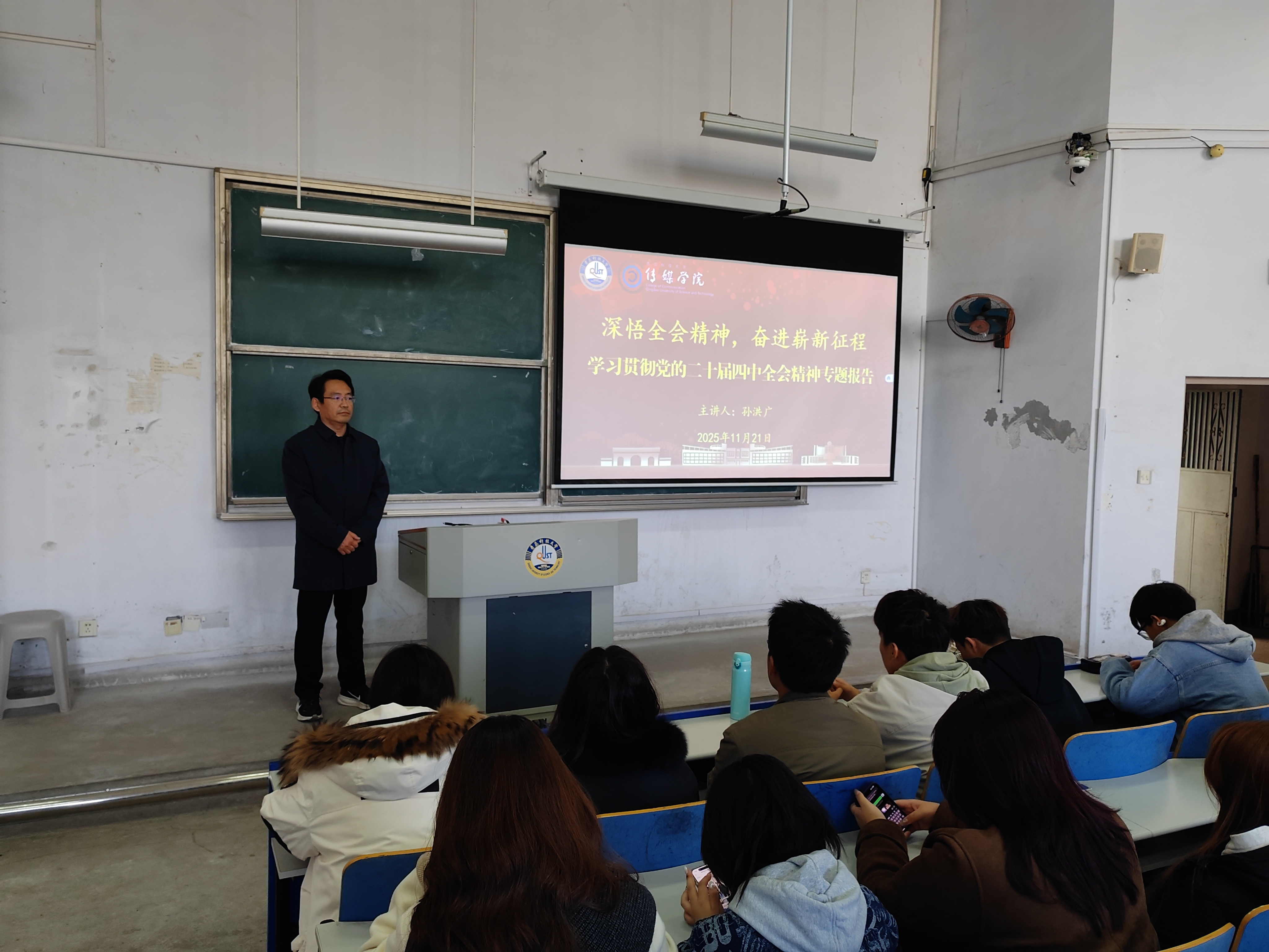 发展实际与青年学子成长需求,围绕掌握党的二十届四中全会基本情况及重大成果,正确认识“十四五”时期我国发展取得重大成就,深刻领会党中央关于国内外形势的基本判断,准确把握“十五五”时期经济社会发展的指导思想、重大原则、主要目标、战略任务和重大举措、根本保证,团结奋进推动党的二十届四中全会精神落地见效等五个方面,以青年角度、青年话语,对全会精神作了全面宣讲和系统阐释。他指出,党的二十届四中全会是在以中国式现代化全面推进强国建设、民族复兴伟业的关键时期召开的一次十分重要的会议。习近平总书记在全会上的重要讲话和全会审议通过的《中共中央关于制定国民经济和社会发展第十五个五年规划的建议》,为未来五年我国发展擘画了宏伟蓝图,也为大学生成长发展指明了方向。