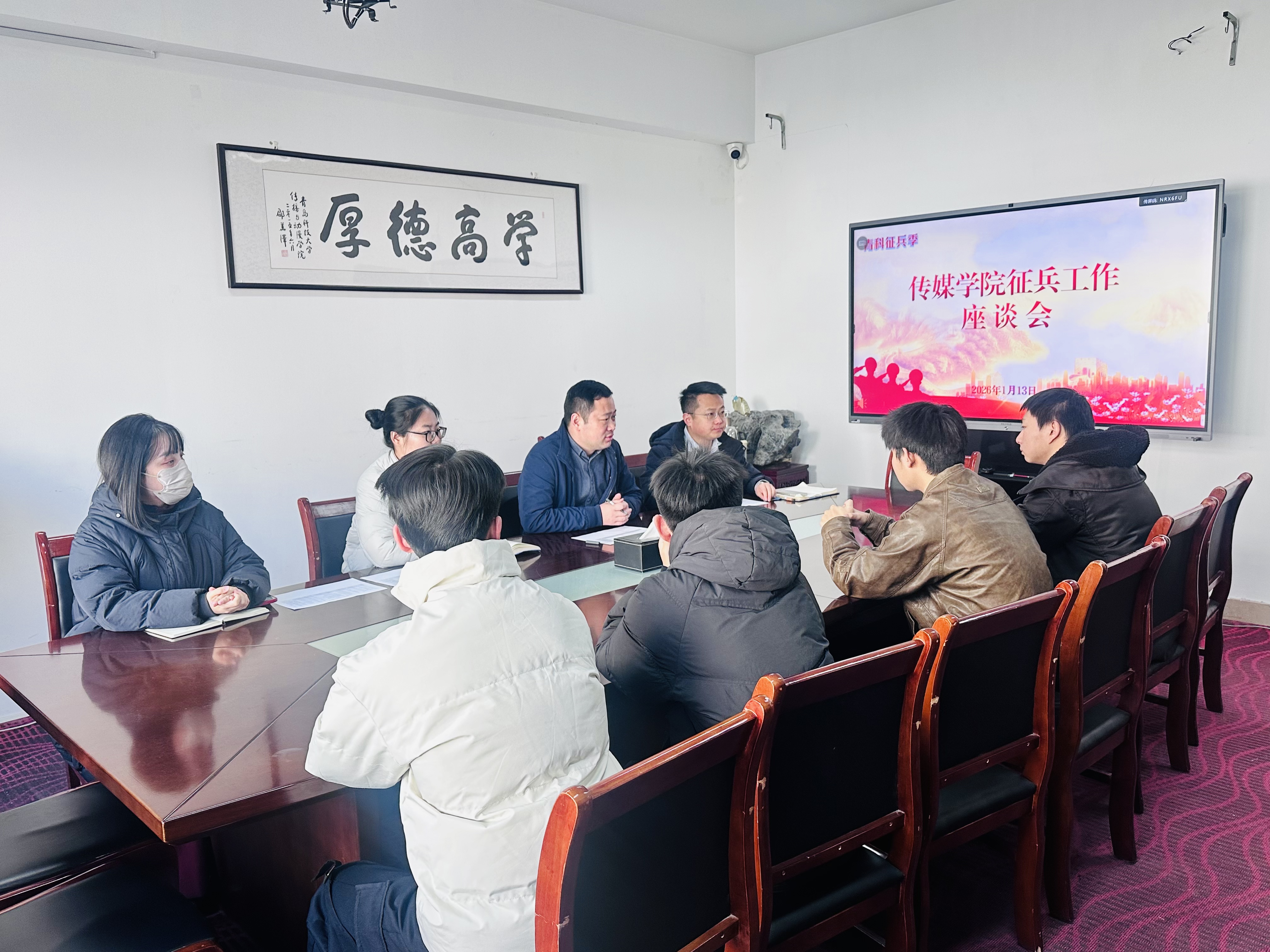 党委副书记兼副院长刘海波、团委副书记兼学工办副主任金莹莹、张鸣、本科毕业生辅导员刘福民,以及报名2026年春季征兵的本科生齐聚一堂,共话参军理想,详解征兵政策。