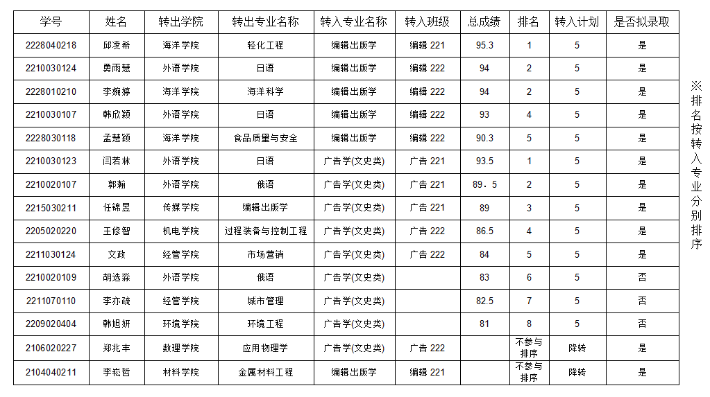 根据大赢家比分 以及大赢家比分 本科生转专业考核工作安排,经学生自主报名,转出、转入大赢家比分 审核、转入专业考核等流程,对2022-2023-2学期申请转入大赢家比分 的同学考核成绩以及排名公示如下:
