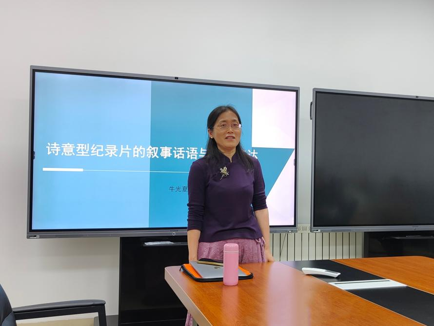 的牛光夏教授以“诗意型纪录片的叙述话语与审美表达”为题展开学术分享,她以西方美学为理论基础引出“诗意”概念并简述了纪录片类型学的相关理论,进而阐明何为诗意型纪录片。随后,她从“诗化的视觉表达与诗意影像叙事”和“诗化的声音效果与诗意话语叙事”两方面着手,指出诗意型纪录片的审美表达,“以有限事物表现无限性的普遍概念或典型,以在场显现不在场”,这正体现出创作者对世界的独特认识和个性化的自我表达,使诗意型纪录片别具一格。她独到的见解弥补了同学们对纪录片认识的不足,同时深刻地启示了审美思考的重要性。