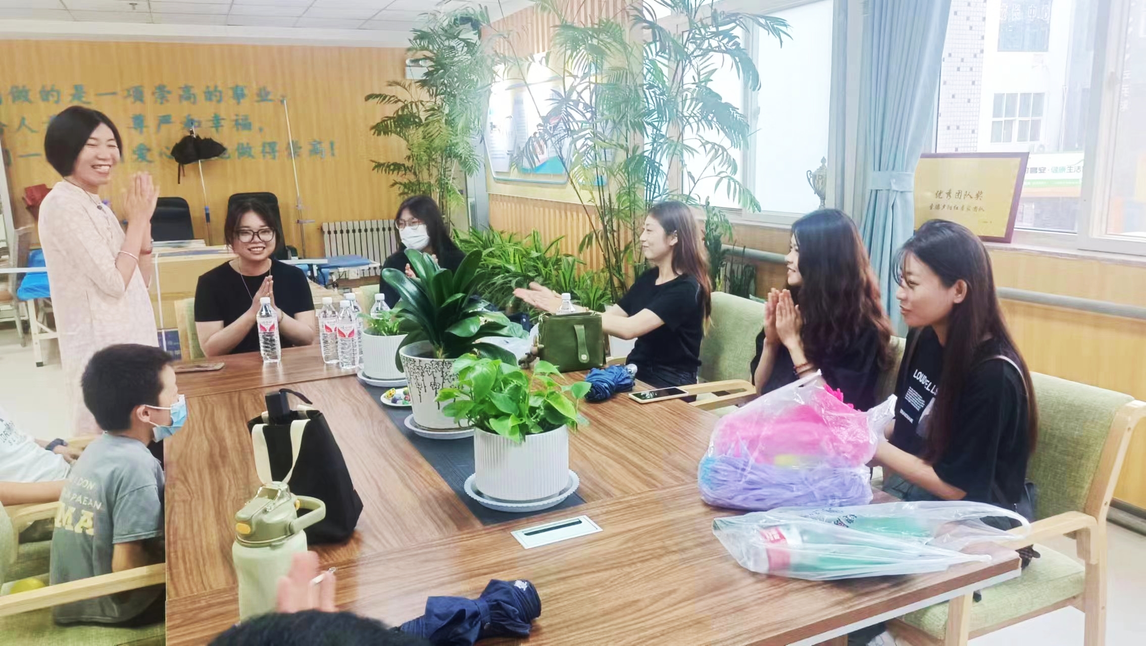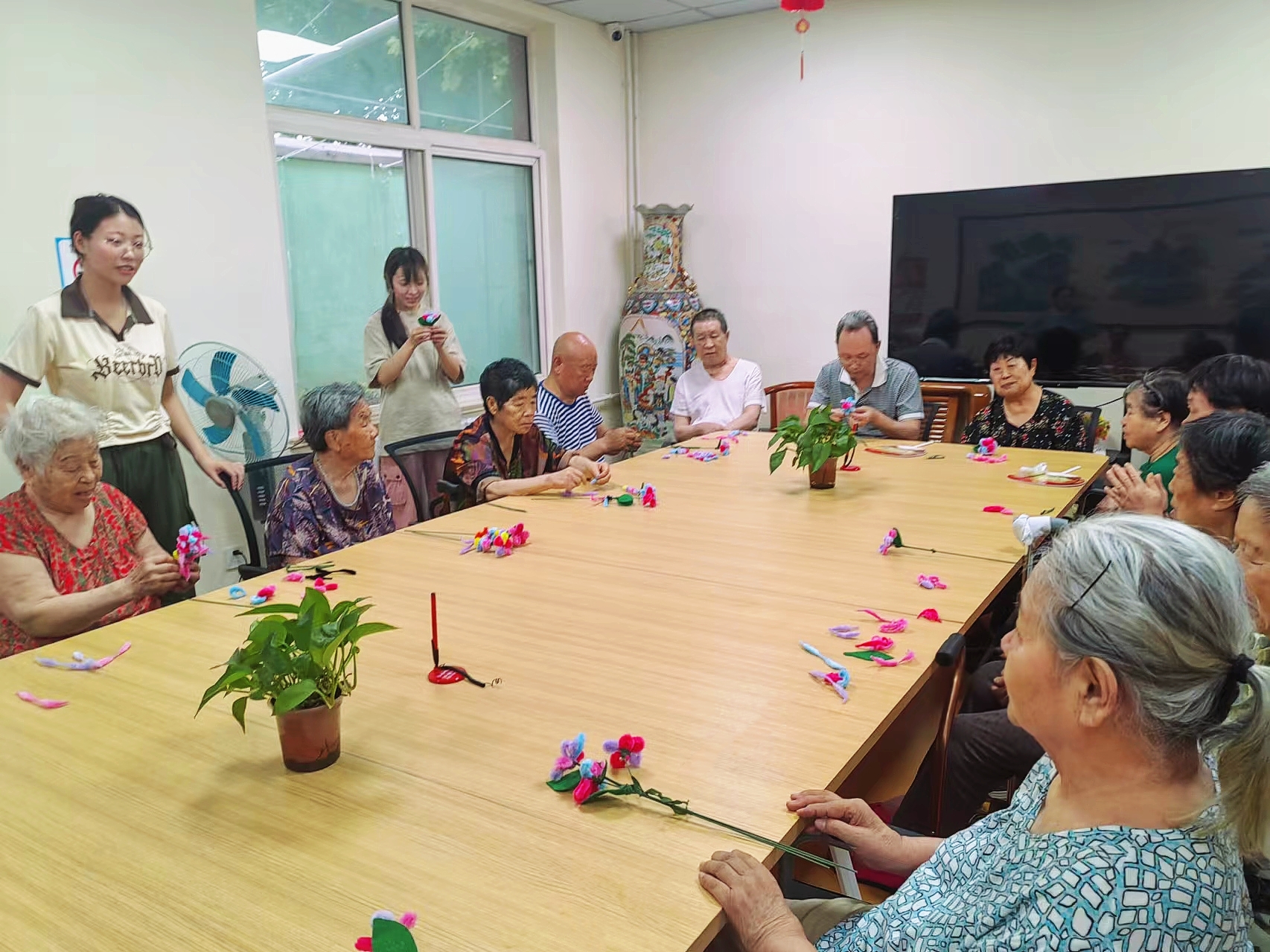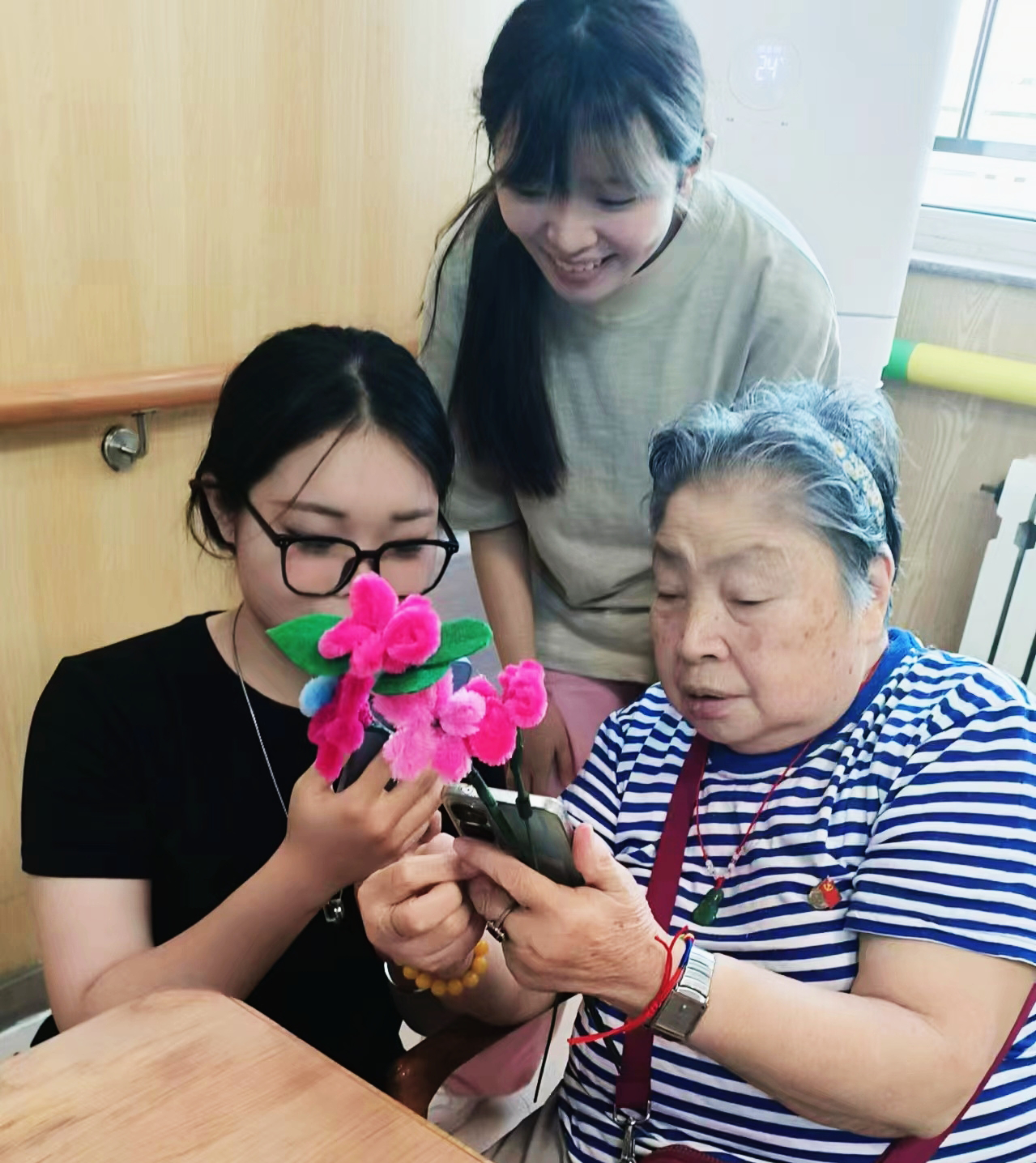 青岛的圣德养老院与汇康源养老院,宛如一座宁静的港湾,为众多老年人提供了安享晚年的温馨家园。实践团成员们怀着满满的关爱与热情踏入了这两座充满温暖的养老院。一进入养老院,实践团成员们便迫不及待地拿出精心准备的扭扭棒,与爷爷奶奶们一同动手,开启了一场创意无限的手工之旅。在大家的共同努力下,一朵朵色彩斑斓、形态各异的花朵绽放而出。制作过程中,欢声笑语不断,温馨的氛围弥漫在每一个角落,老人们的脸上洋溢着幸福的笑容,那笑容如同春日暖阳,温暖着在场每一个人的心。