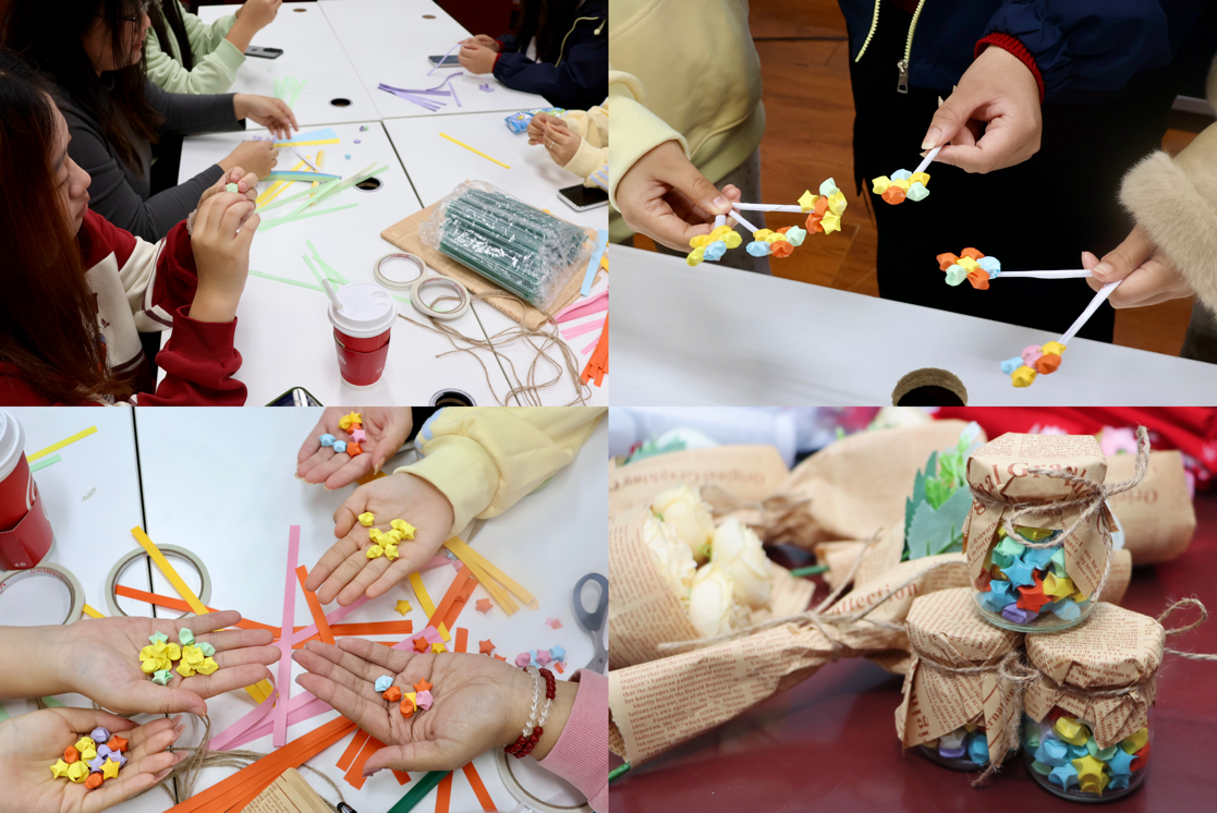 310会议室进行“星星知我心”活动。同学们用星星纸折出星星花,搭配吸管、包装纸组装成花束,在贺卡上写下专属祝福。当指尖的温度融入手工,同学们成为了温情的主动传递者,把对老师的万千感激,藏进了这束永不凋谢的“星星花”中。