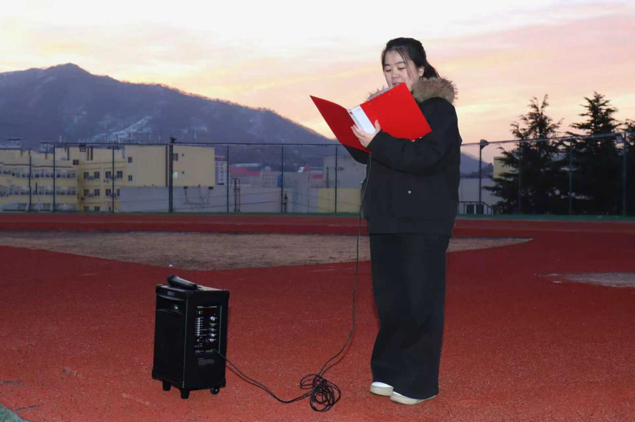 清晨6:30,天色微明,寒风凛冽,同学们准时集合,现场秩序井然,氛围庄重。7:00,主持人宣布仪式正式开始,国旗护卫队迈着铿锵有力的正步护送国旗入场,身姿挺拔,目光坚定,展现出时代新人的昂扬姿态。伴随着雄壮的《义勇军进行曲》,五星红旗冉冉升起,全体人员肃立行注目礼。朝阳下,国旗迎风招展;晨光里,目光坚定炽热,这一刻,爱国之情在每个人心中激荡,民族自豪感油然而生。