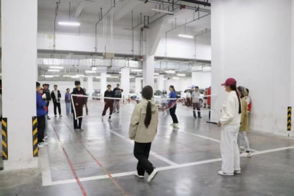 展开激烈角逐。赛场上,毽球在空中划出一道道灵动弧线,队员们反应迅速、配合默契,时而飞身跃起完成精准扣杀,时而弯腰俯身救起险球,每一次攻防转换都扣人心弦。双方队员你来我往、互不相让,精彩的比拼引得现场观赛师生阵阵喝彩,地下车库内的赛事氛围被一次次推向高潮。