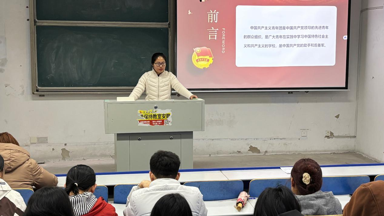 团委副书记兼学工办副主任张鸣围绕《严守团纪:锤炼先进品格与青春担当》展开讲解。她结合典型案例与工作实际,阐释了团的纪律建设的重要性,号召入团积极分子自觉强化组织观念、严守团内规矩,在学习和生活中发挥先锋模范作用,以实际行动展现入青年学生的先进性和纯洁性。