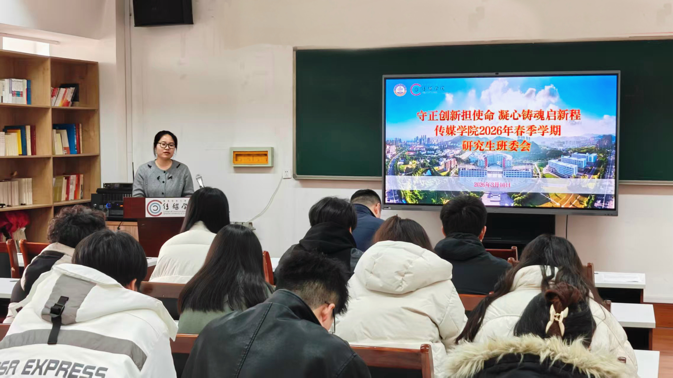 研究生骨干过去一年的付出表示诚挚感谢,对各项工作取得的成效给予充分肯定。结合新学期研究生培养与班级管理工作要求,他对全体学生骨干提出三点殷切期望:一是找准自身定位发挥“领头雁”作用。要切实增强使命感与紧迫感,精准把握当前传媒硕士培养面临的新情况、新任务,充分发挥研究生骨干的模范带头作用;二是涵养“吃气”的胸襟与“吃苦”的品格。要积极参与各类学团工作,深耕专业学术研究,加强朋辈骨干间的交流互鉴,在比学赶超中实现集体共同成长;三是立足班级岗位职责真抓实干。科学统筹规划2026年春季学期各项工作,抓实抓细、用心用情,密切关注班级同学的身心健康、学业状态与师生沟通情况。