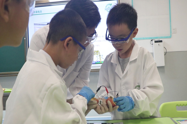 ,参观神奇的实验室。在这里,万华的老师带领小朋友们做了三个实验:水果电池、魔法瓶子、舞动的彩虹,在此期间,志愿者和讲课老师一起帮助小朋友。小朋友们戴着护目镜、手套,认真听讲,细心操作,不仅收货了知识,还收获了快乐。