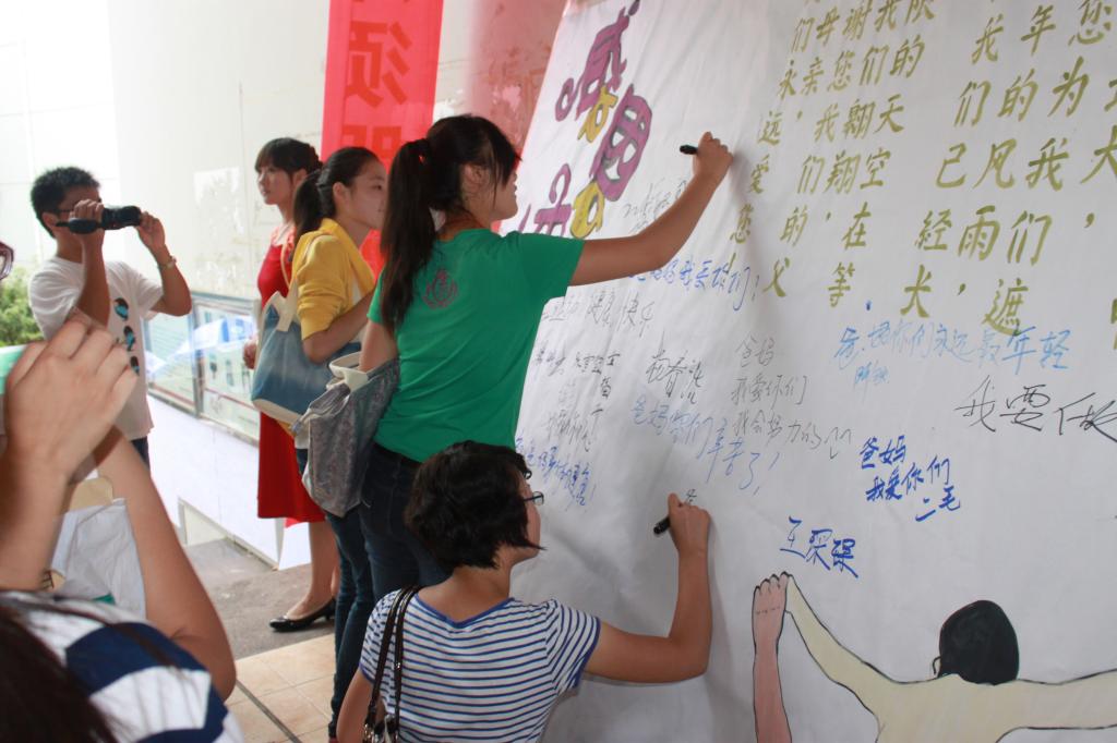 在现场也布置了感恩墙,让学生留下对父母的感谢之语,加强对学生的感恩教育。