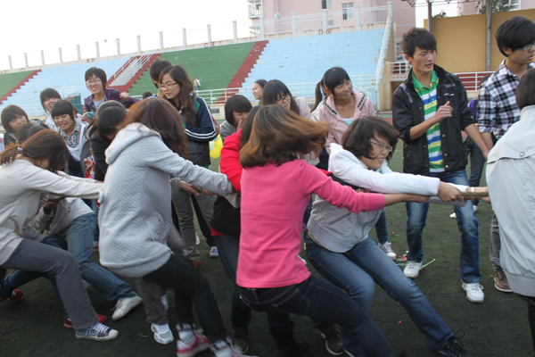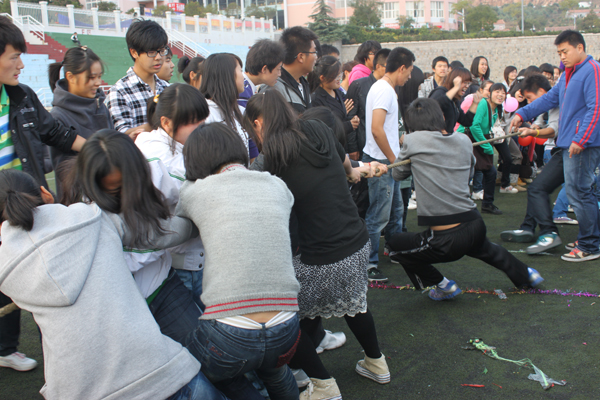 女生部主办,旨在为大一新生提供相互交流的机会,加强班级凝聚力,感受大学的丰富生活,弘扬积极向上的传播精神。比赛项目包括“快乐向前冲”8人绑腿跑、趣味接力、拔河比赛等多个项目。在趣味接力的赛场上,赛道被分为四个部分,每部分都由男女生合作完成。男生蒙眼背女生,女生负责“导盲”;男女协作坐爆气球向前跑……创意无限,乐趣无穷。最后的拔河比赛更是将活动推向了高潮,加油声此起彼伏,比赛结果牵动着每个人的心。会后,由分团委李倩老师为获奖班级颁发了奖状及奖品。